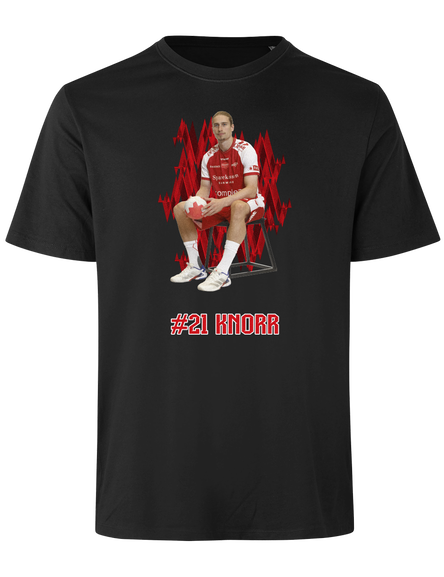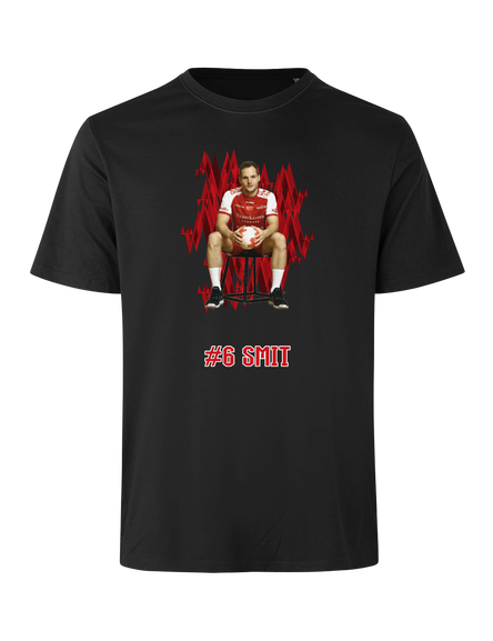 Støt Aalborg Håndbold og vis din opbakning til din favoritspiller med denne stilrene spiller t-shirt. Designet kombinerer et dynamisk grafisk udtryk med et motiv af spilleren samt spillerens navn og nummer under motivet.