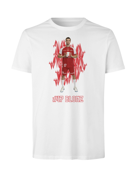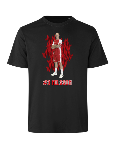 Støt Aalborg Håndbold og vis din opbakning til din favoritspiller med denne stilrene spiller t-shirt. Designet kombinerer et dynamisk grafisk udtryk med et motiv af spilleren samt spillerens navn og nummer under motivet.