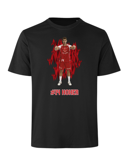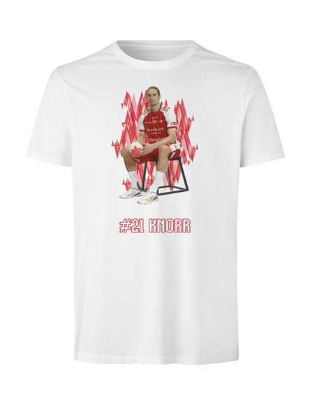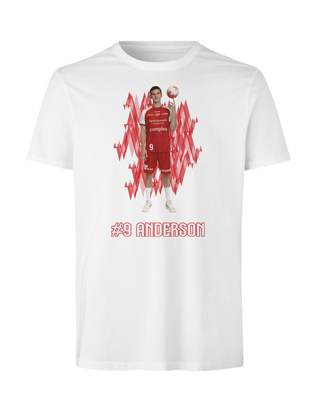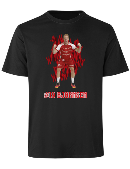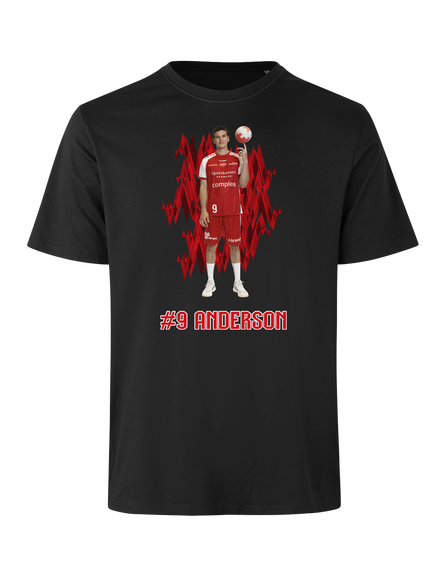 Støt Aalborg Håndbold og vis din opbakning til din favoritspiller med denne stilrene spiller t-shirt. Designet kombinerer et dynamisk grafisk udtryk med et motiv af spilleren samt spillerens navn og nummer under motivet.