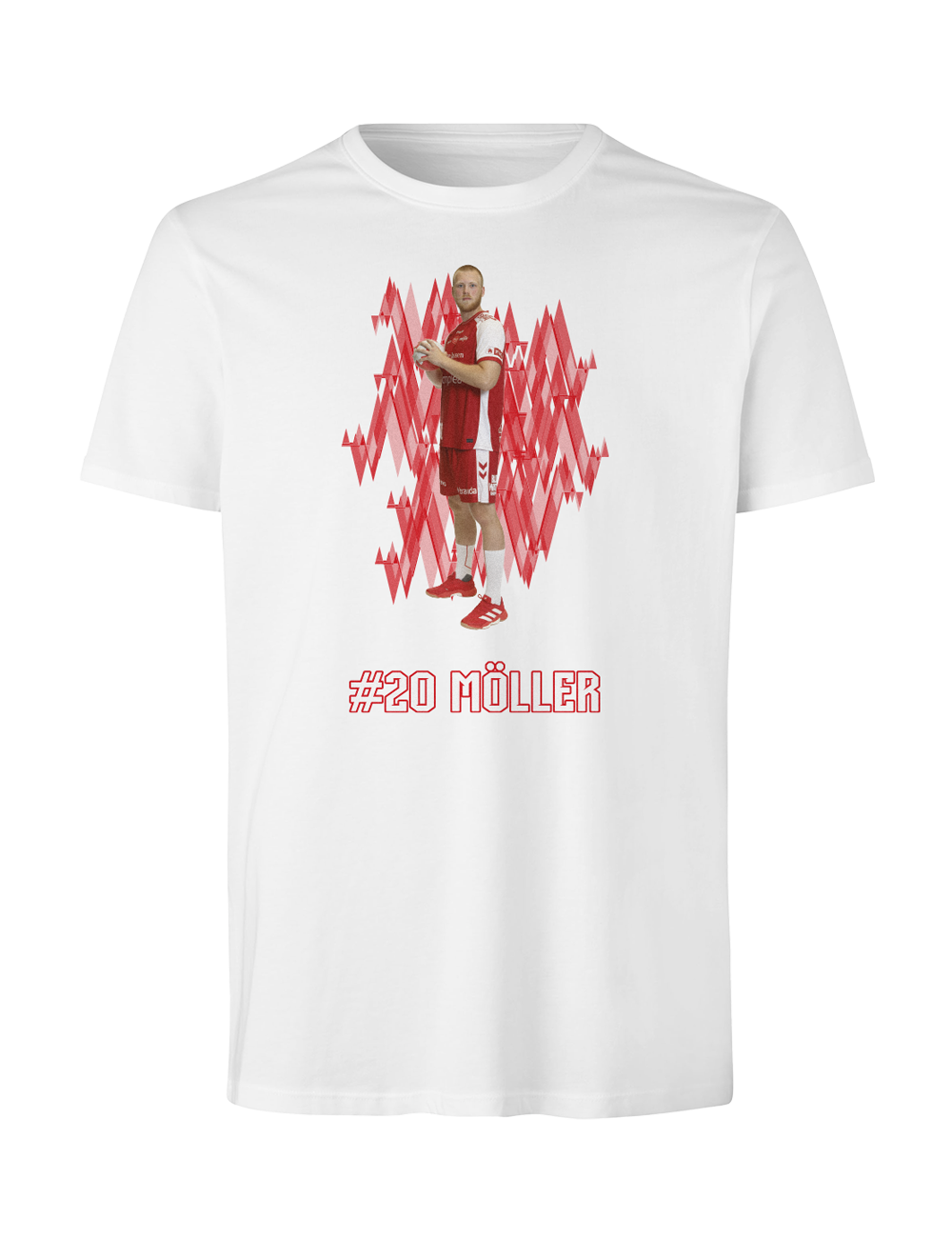 Støt Aalborg Håndbold og vis din opbakning til din favoritspiller med denne stilrene spiller t-shirt. Designet kombinerer et dynamisk grafisk udtryk med et motiv af spilleren samt spillerens navn og nummer under motivet.