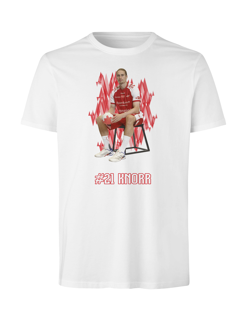 Støt Aalborg Håndbold og vis din opbakning til din favoritspiller med denne stilrene spiller t-shirt. Designet kombinerer et dynamisk grafisk udtryk med et motiv af spilleren samt spillerens navn og nummer under motivet.