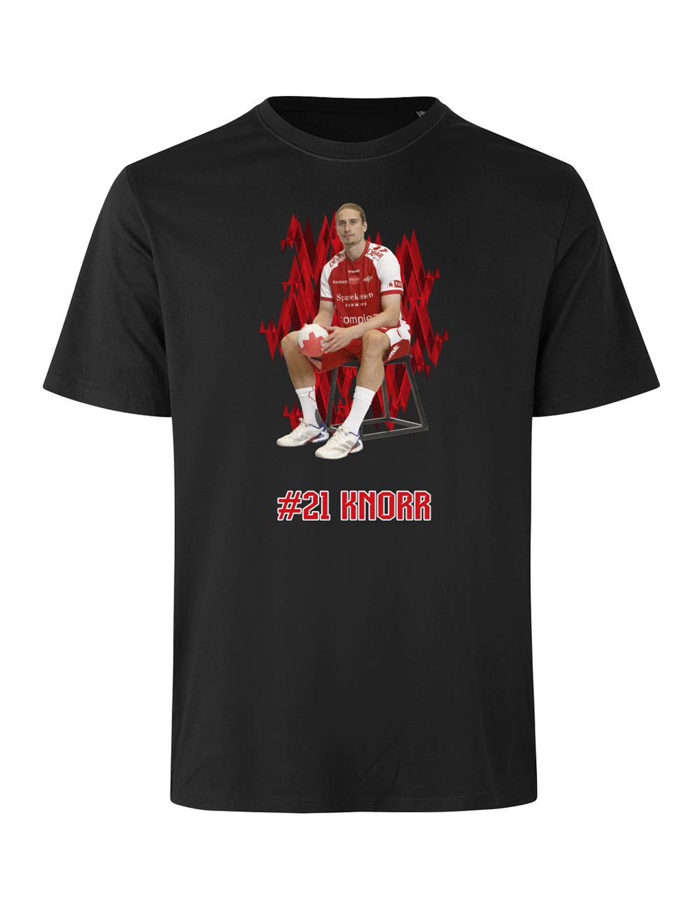 Støt Aalborg Håndbold og vis din opbakning til din favoritspiller med denne stilrene spiller t-shirt. Designet kombinerer et dynamisk grafisk udtryk med et motiv af spilleren samt spillerens navn og nummer under motivet.