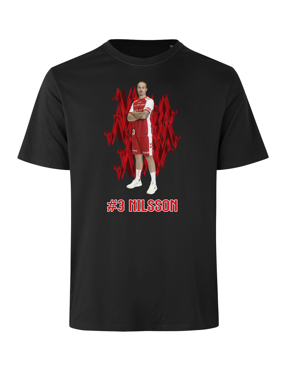 Støt Aalborg Håndbold og vis din opbakning til din favoritspiller med denne stilrene spiller t-shirt. Designet kombinerer et dynamisk grafisk udtryk med et motiv af spilleren samt spillerens navn og nummer under motivet.