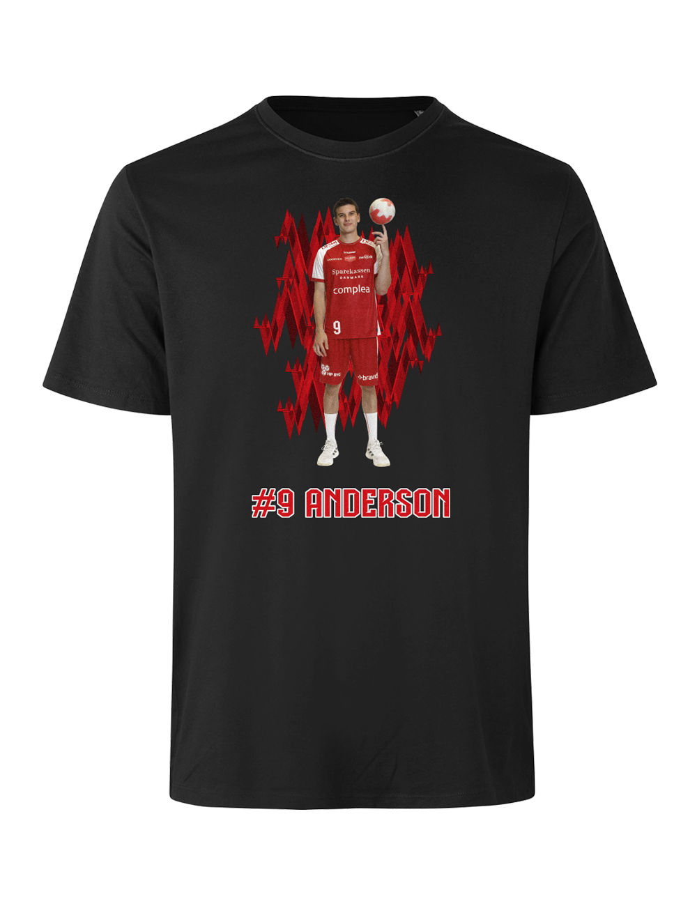 Støt Aalborg Håndbold og vis din opbakning til din favoritspiller med denne stilrene spiller t-shirt. Designet kombinerer et dynamisk grafisk udtryk med et motiv af spilleren samt spillerens navn og nummer under motivet.