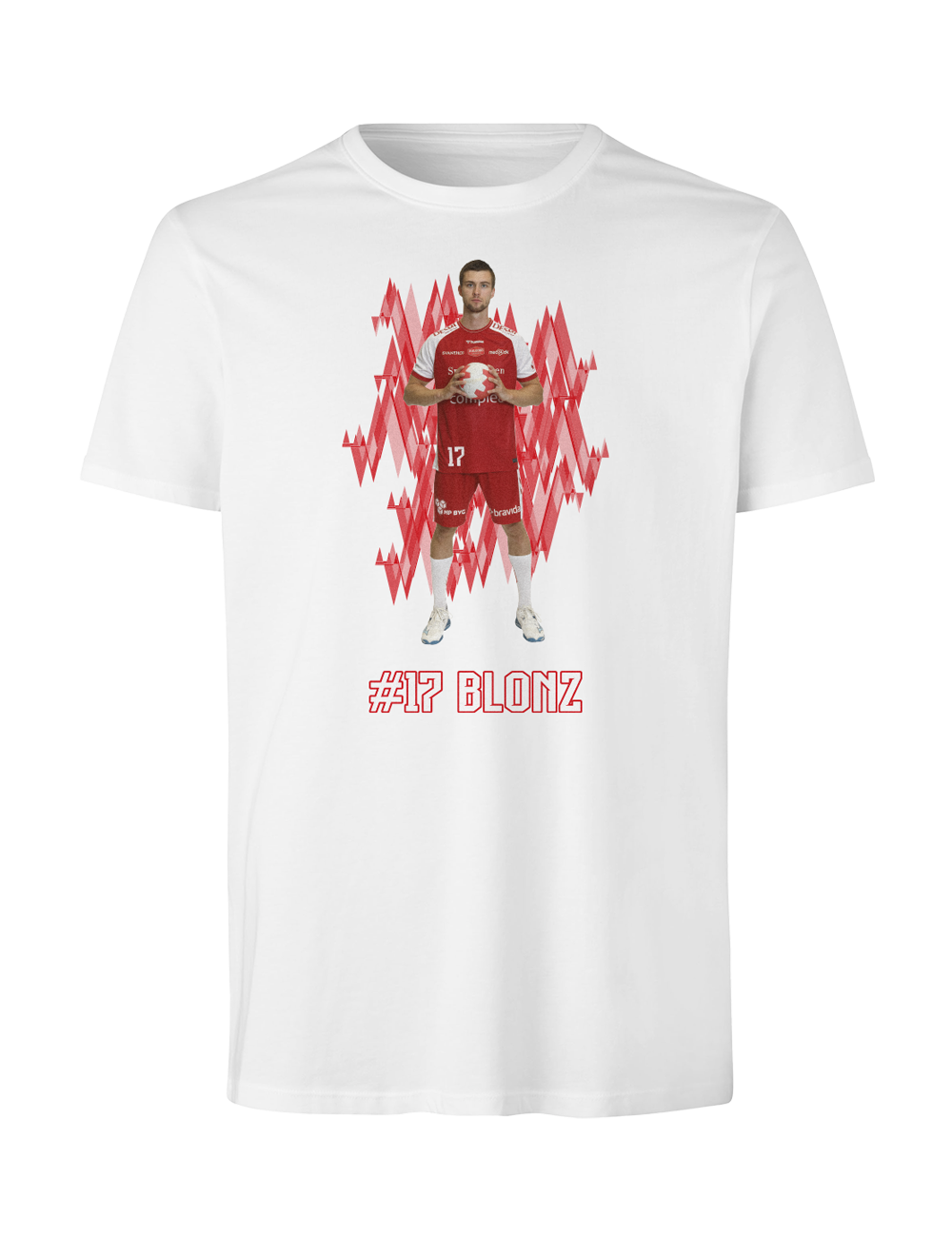 Støt Aalborg Håndbold og vis din opbakning til din favoritspiller med denne stilrene spiller t-shirt. Designet kombinerer et dynamisk grafisk udtryk med et motiv af spilleren samt spillerens navn og nummer under motivet.